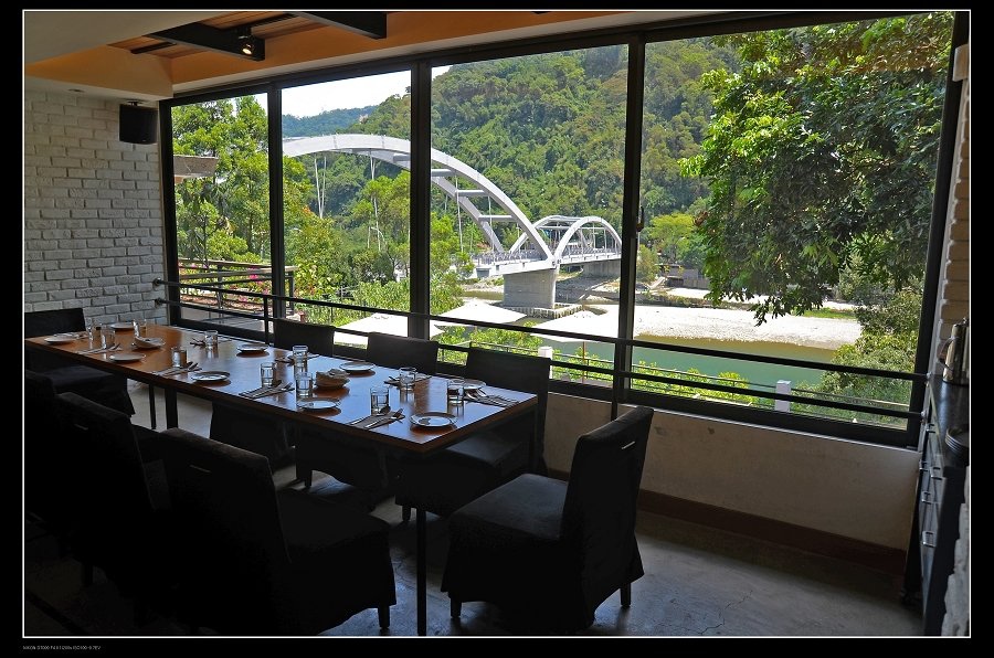 透過餐廳可看到廣興橋及對面的青山