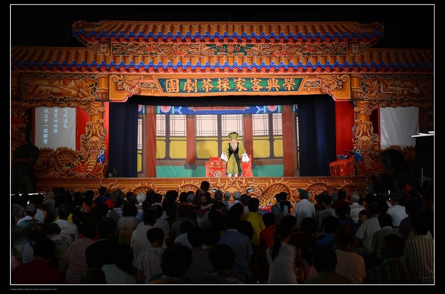 小時後看過野台歌仔戲,在這剛好遇到客家採茶劇,旁邊還有字幕,很進步喔