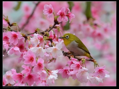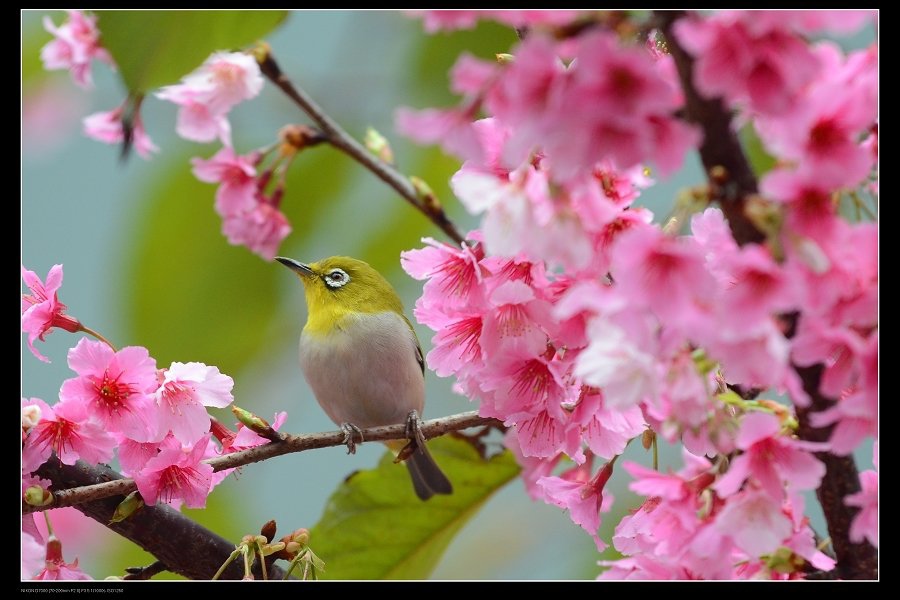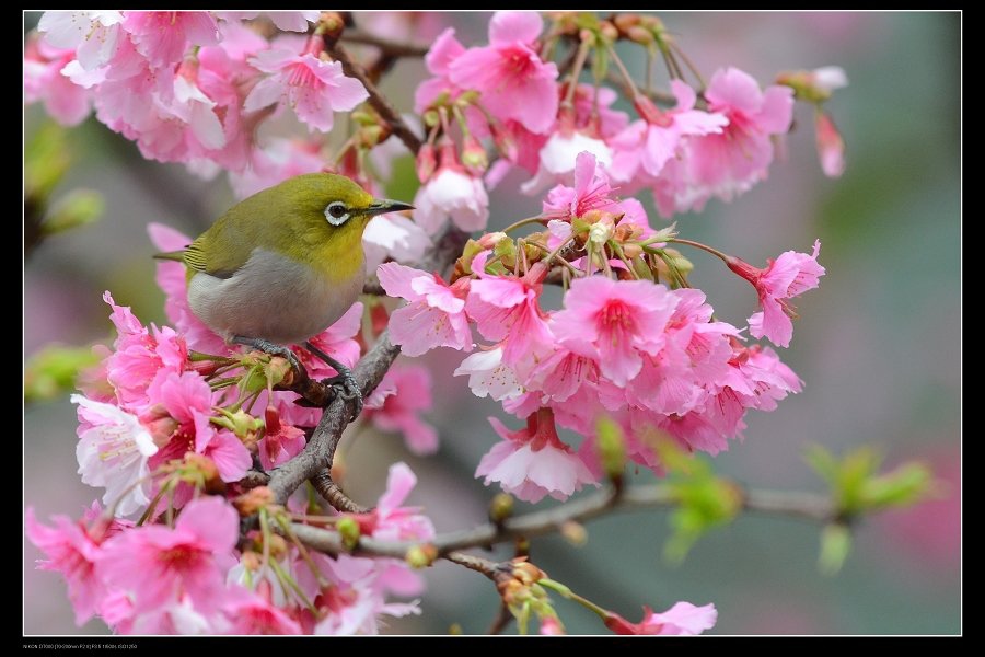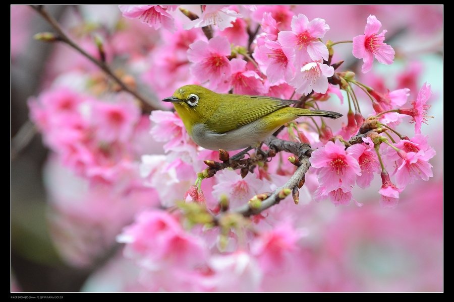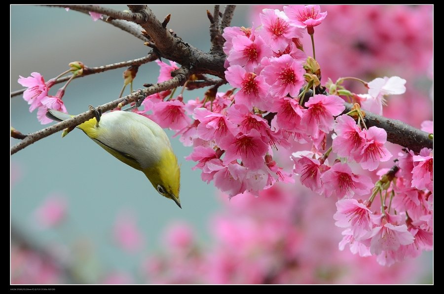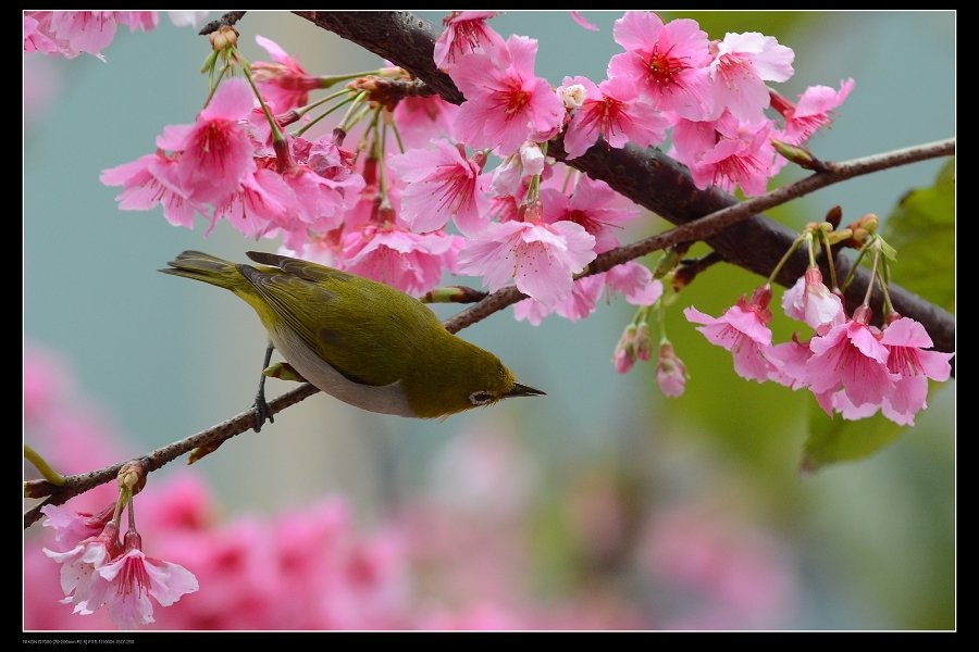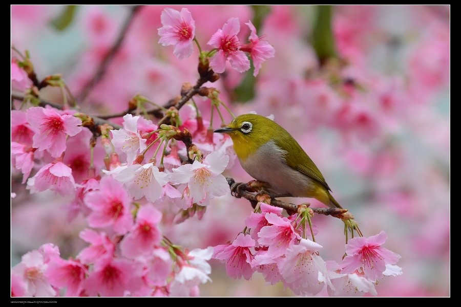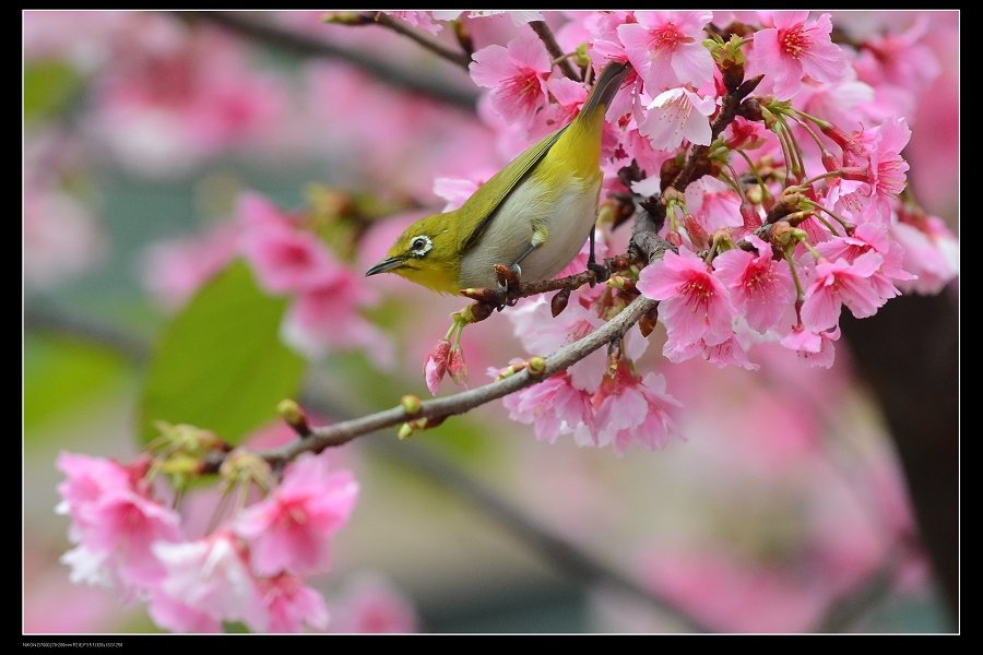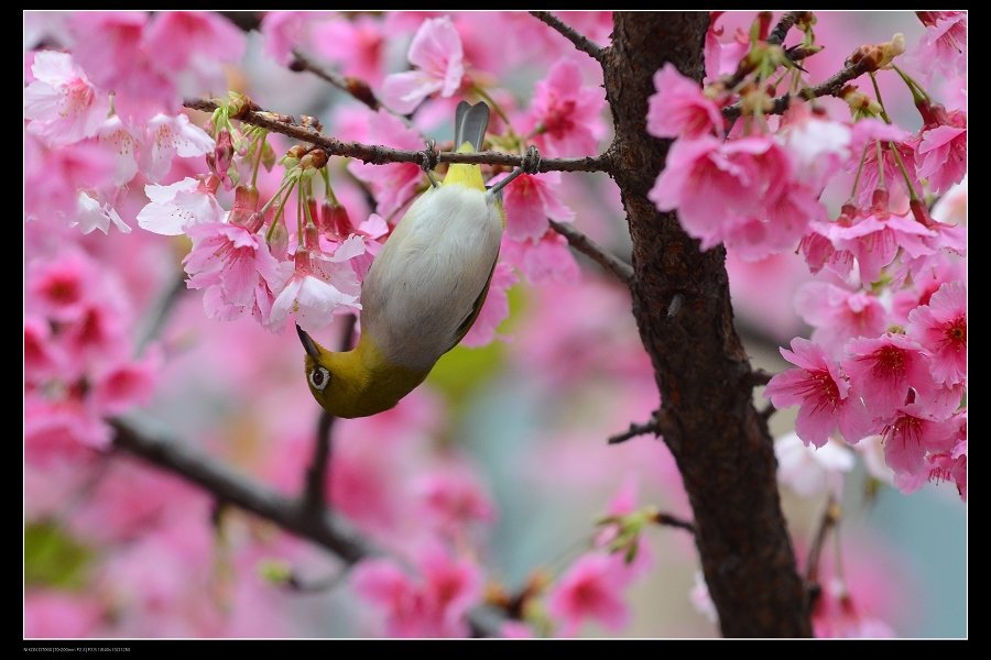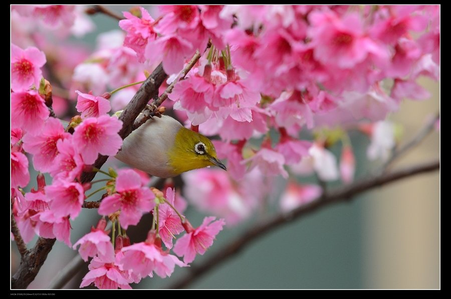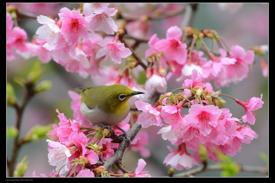 200mm鏡頭要打鳥,只能拍這種近在眼前的富士櫻與綠繡眼