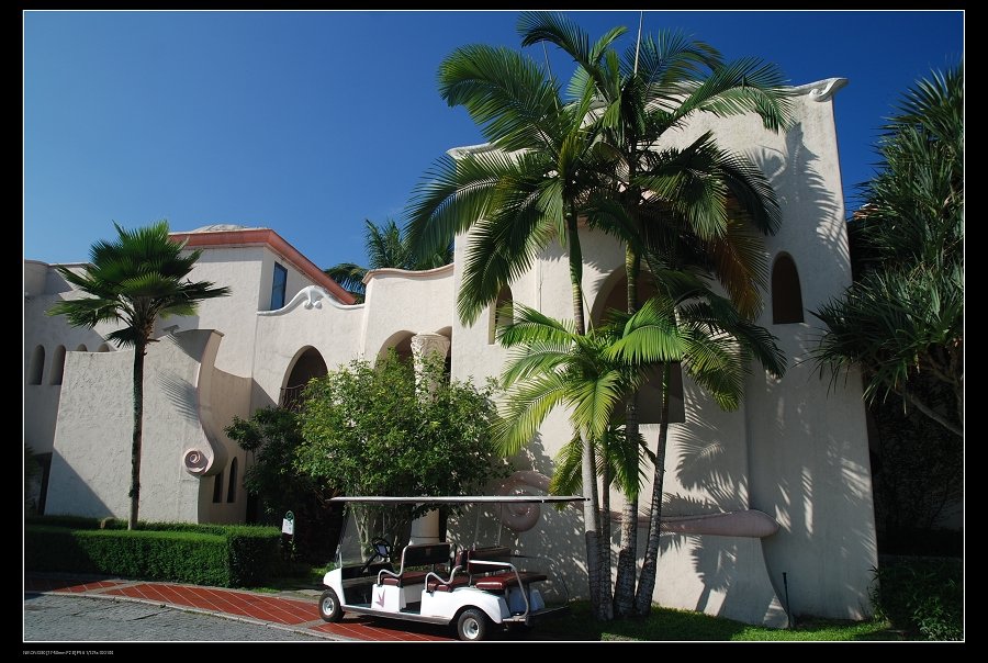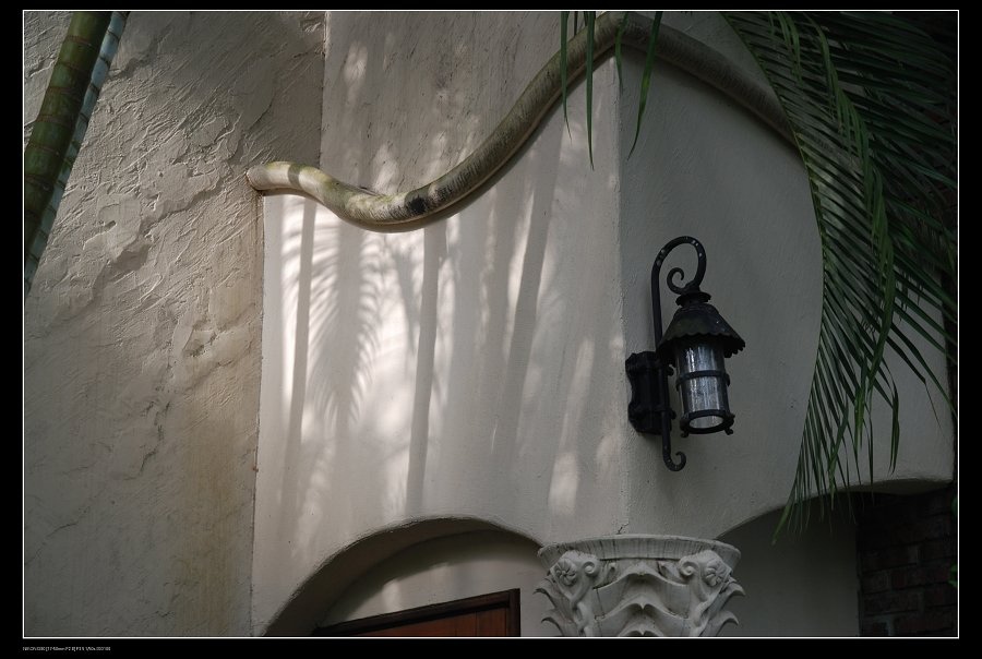 在棕梠樹包圍下,光影也幫白牆畫上許多動人圖像