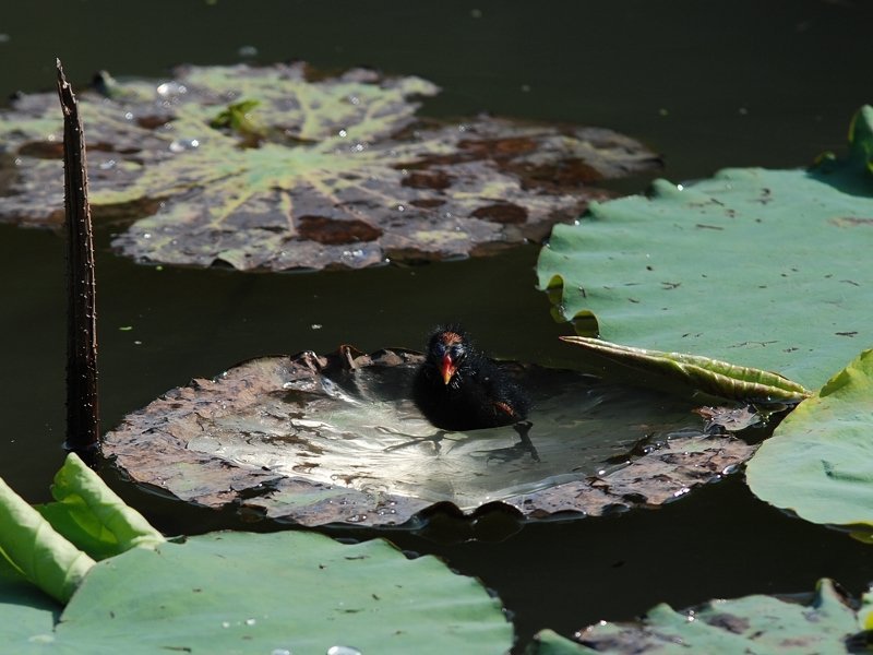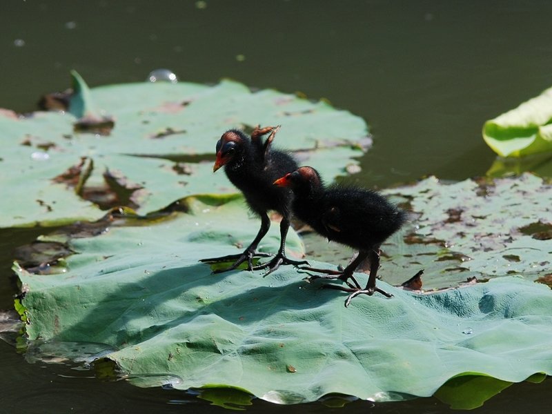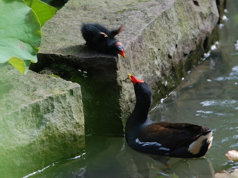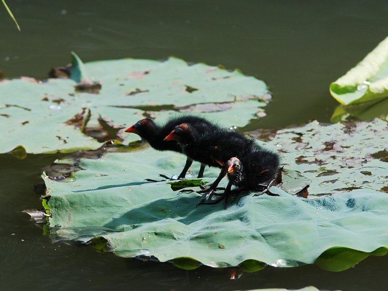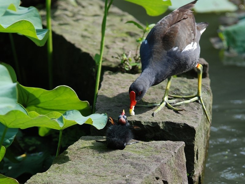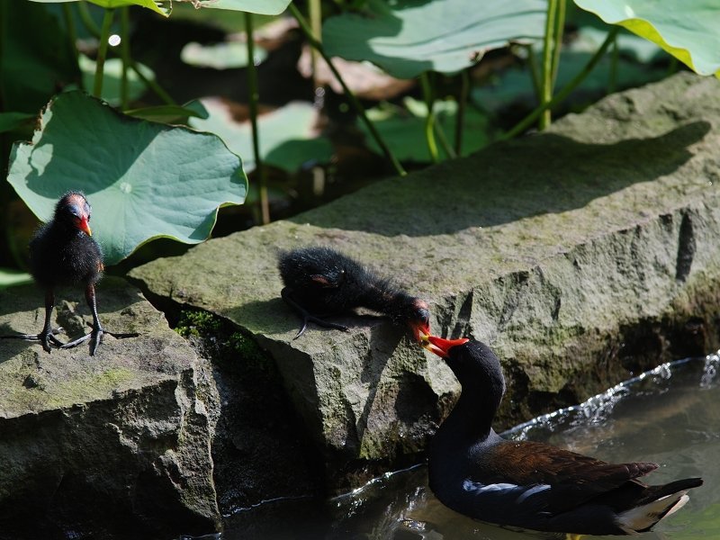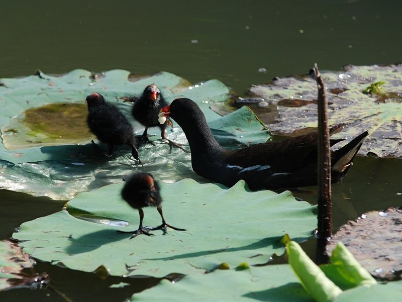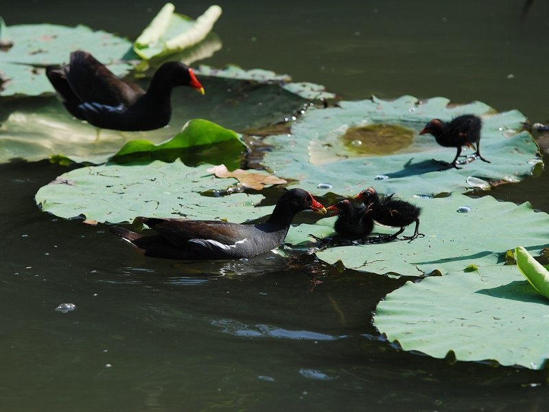 紅冠水鷄夫婦帶著剛孵化的小水鷄出外野餐