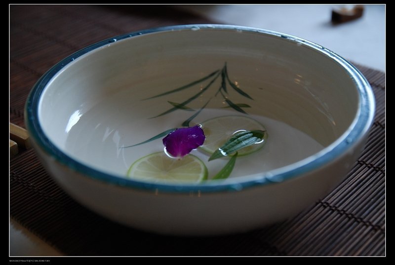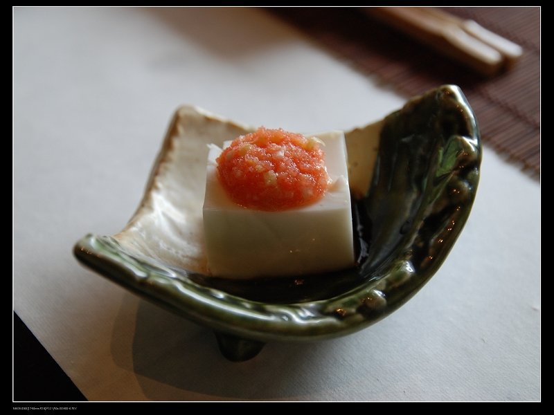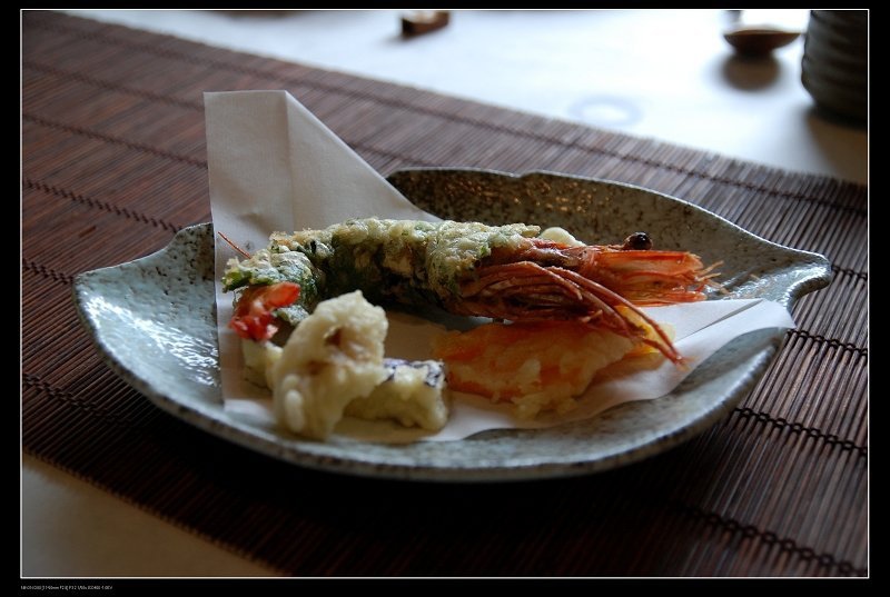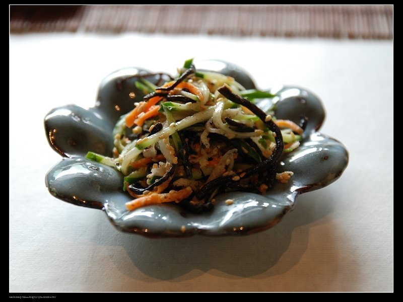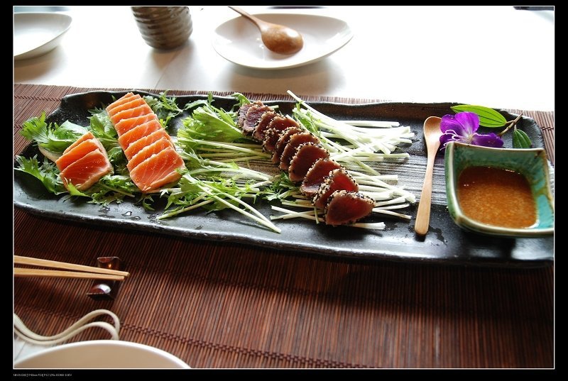 外表炙過的生魚片,搭配特殊醬料,底下是水芹菜,與一般口感完全不同
