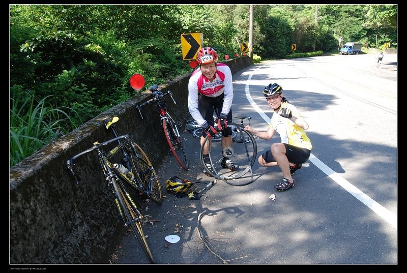但好景不常,才騎了12公里,突然覺得車子不穩,原來後輪爆胎了,幸好Bike車隊的兩位大哥路過,即時幫我補了車胎,但兩位大哥建議,公路車胎胎壓較高,雖然補過,但不保證能用,而且一路到宜蘭都沒有自行車店,中途沒有備胎的話很危險,因此建議我趁車胎有氣趕緊下山,以免到時走路牽車回新店