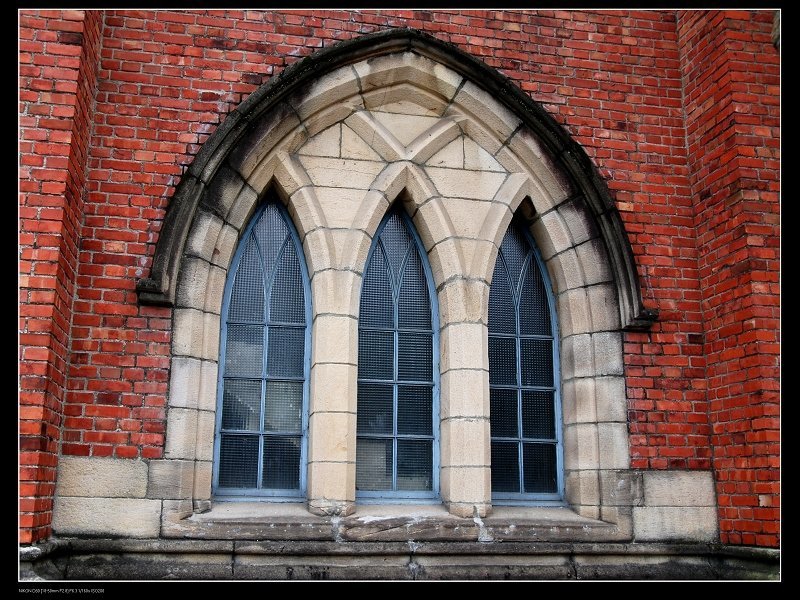 非常有特色的三尖拱窗,是用唭哩岸石打造而成,幾何圖形的設計,也需要很高的打石技術來完成