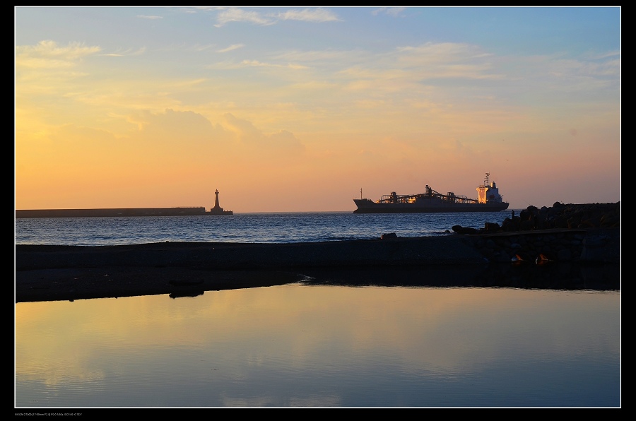 一艘貨輪迎向美麗的晨曦,準備進港