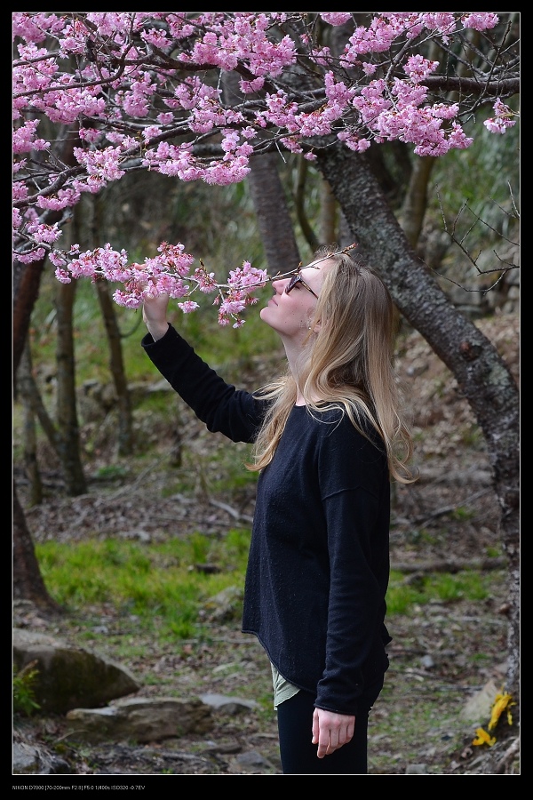 八重櫻,紅粉佳人與杉木合影