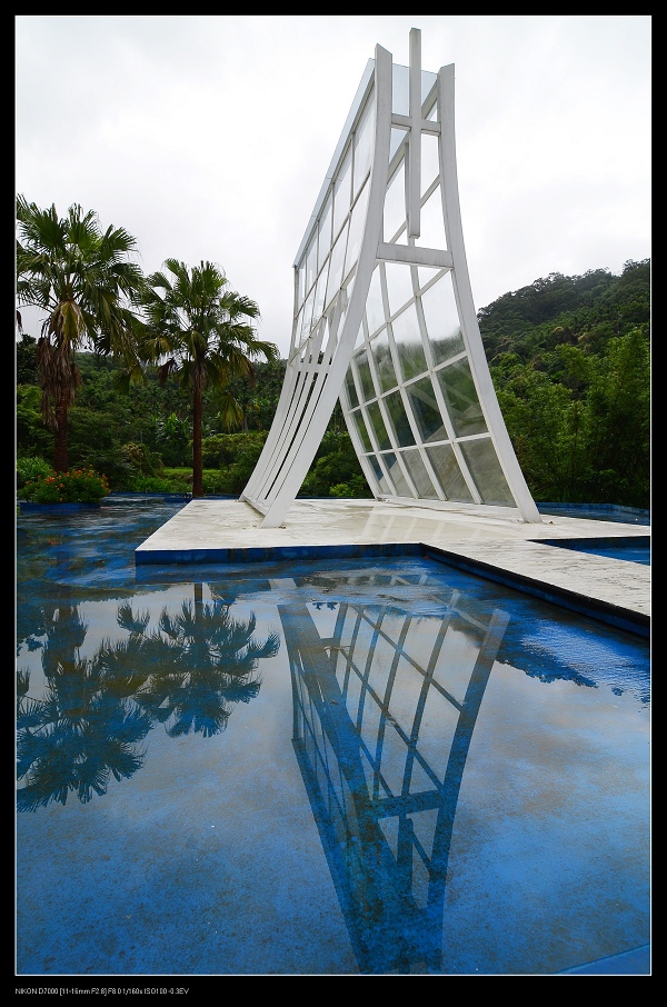 雖然剛下過雨,但水池中依然沒有水,只能靠地上積水拍倒影