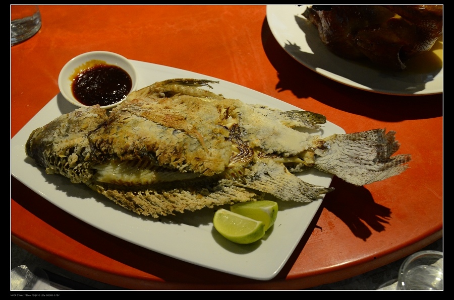 鹽烤魚也是要先預定,因為是自己放養的雕魚,揭開外皮,魚肉鮮嫩,