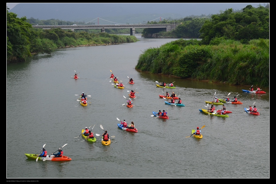 快到貢寮的雙溪中,遇到一群色彩豔麗的獨木舟