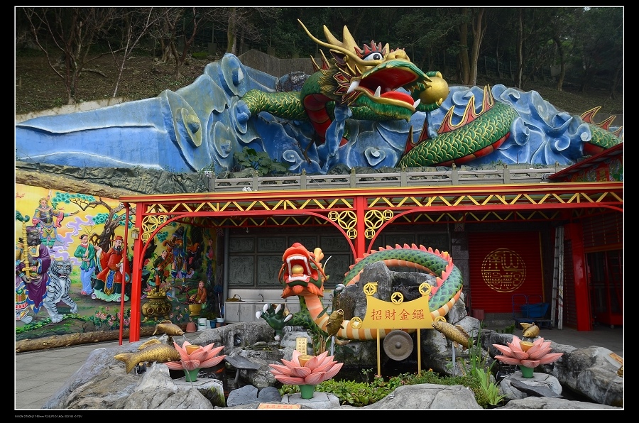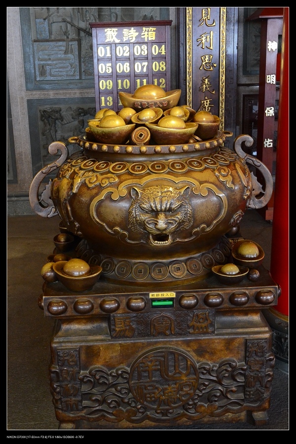 走到戶外,還有一連花祈願池,香客可以拿銅板投向招財金鑼,投中就會有好財運囉