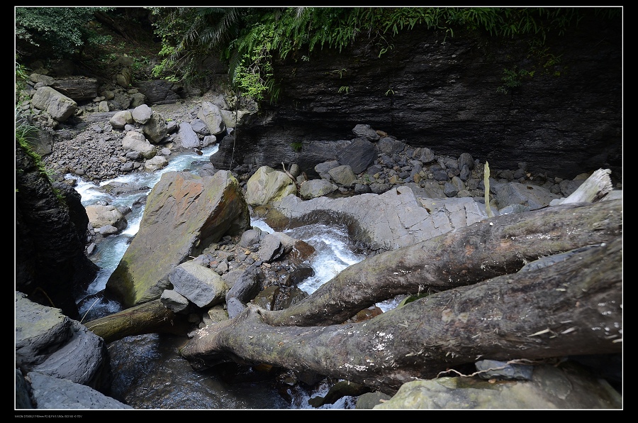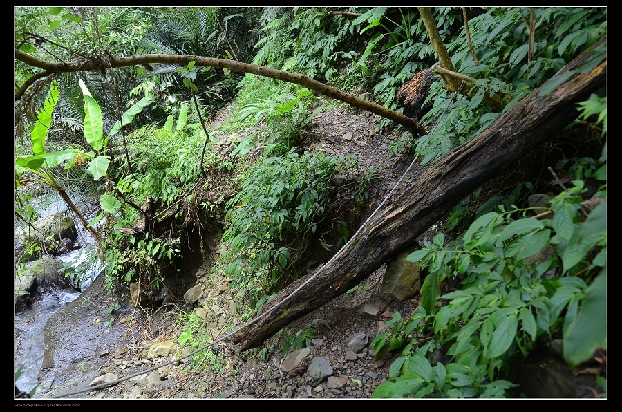 上來的路因大水早被沖毀,這兩隻木頭很巨大,照片無法顯現它的險峻,那位大哥寧可走水路,不敢硬爬上來,因為帶了一身攝影裝備,又沒防滑鞋,只好打消下溪谷念頭