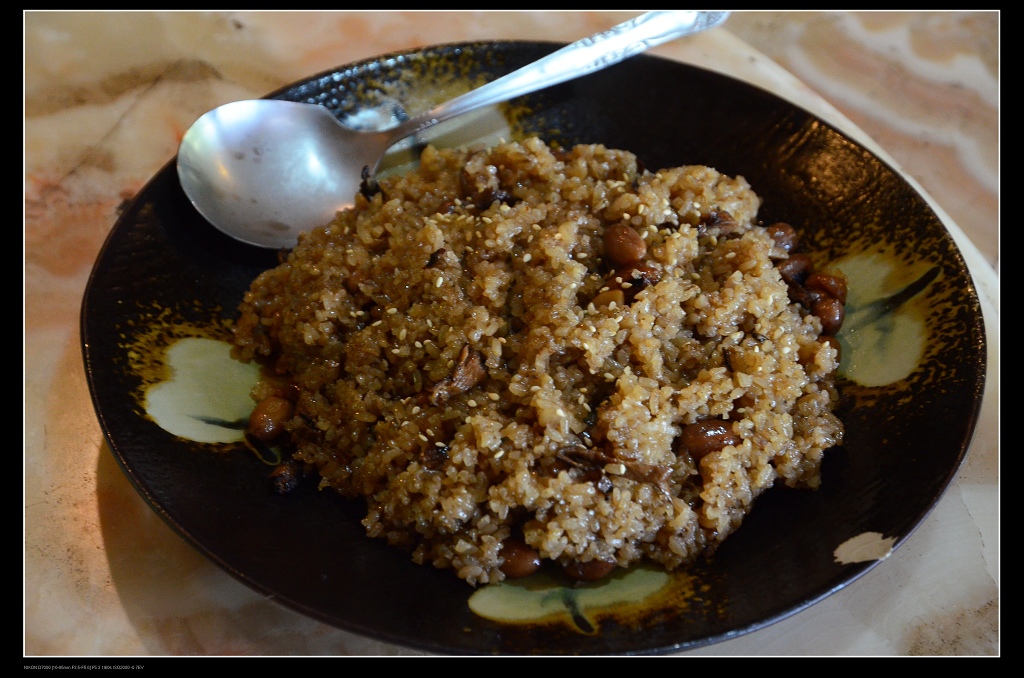 這裡是預約制無菜單料理,每人350元起,這茶仔油油飯裡還有芝麻,花生,香菇等,看起來古早味,但因有茶仔油,風味又很不一樣