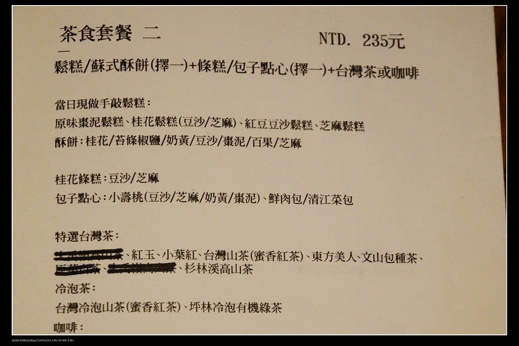 這裡套餐從 220元的鬆糕,桂花條糕,蘇式酥餅,千層糕,春捲,琥珀桂圓,包子,...家一壺茶或咖啡,到一桌人可共用的800元提籃套餐,可以自行挑選搭配