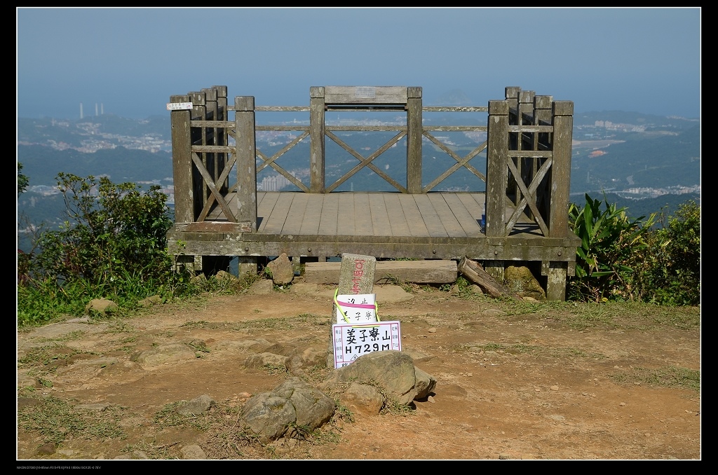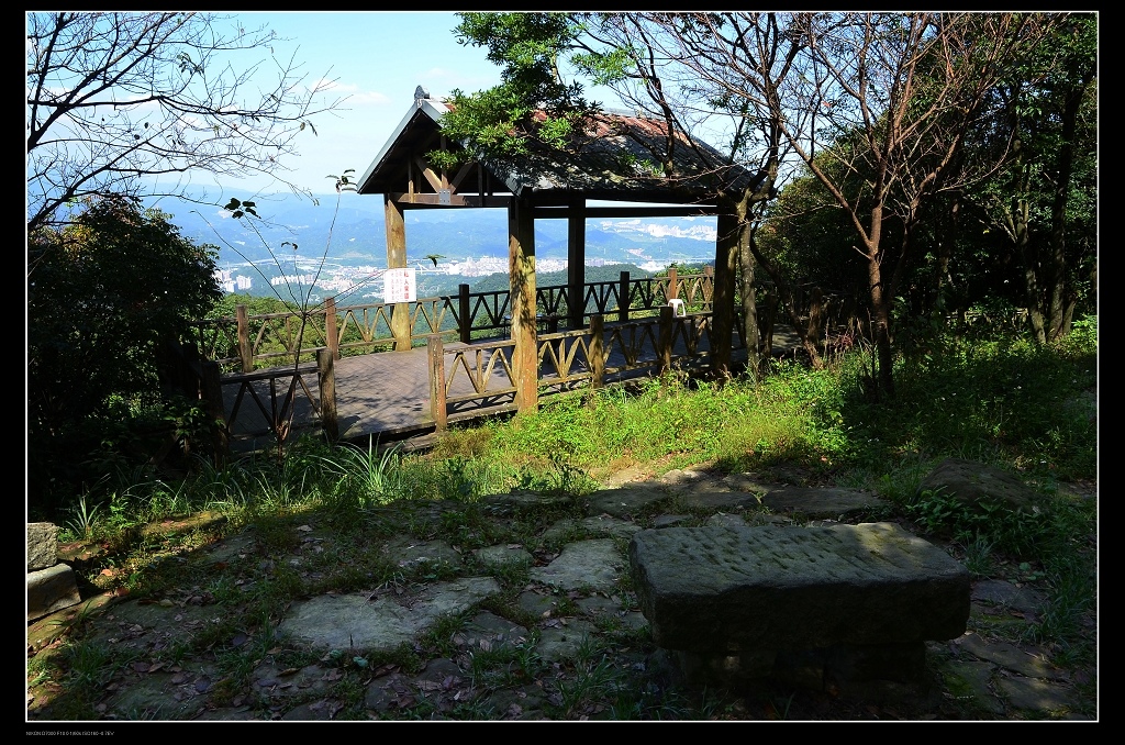 路標對面有一觀景涼亭,若不想爬山,在這涼亭就可看到從松山機場到基隆沿途的所有城鎮,視野相當好