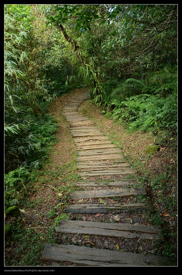 姜子寮山步道沿途都鋪設枕木,相當好走,步道起點到三角點長度約1.38公里,總共2400個枕木階梯
