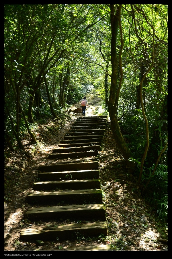 姜子寮步道每100階就會在枕木上看到這帖牌,上面標註還剩多少階,所以看到這塊第一階的鐵牌,就表示到達山頂囉
