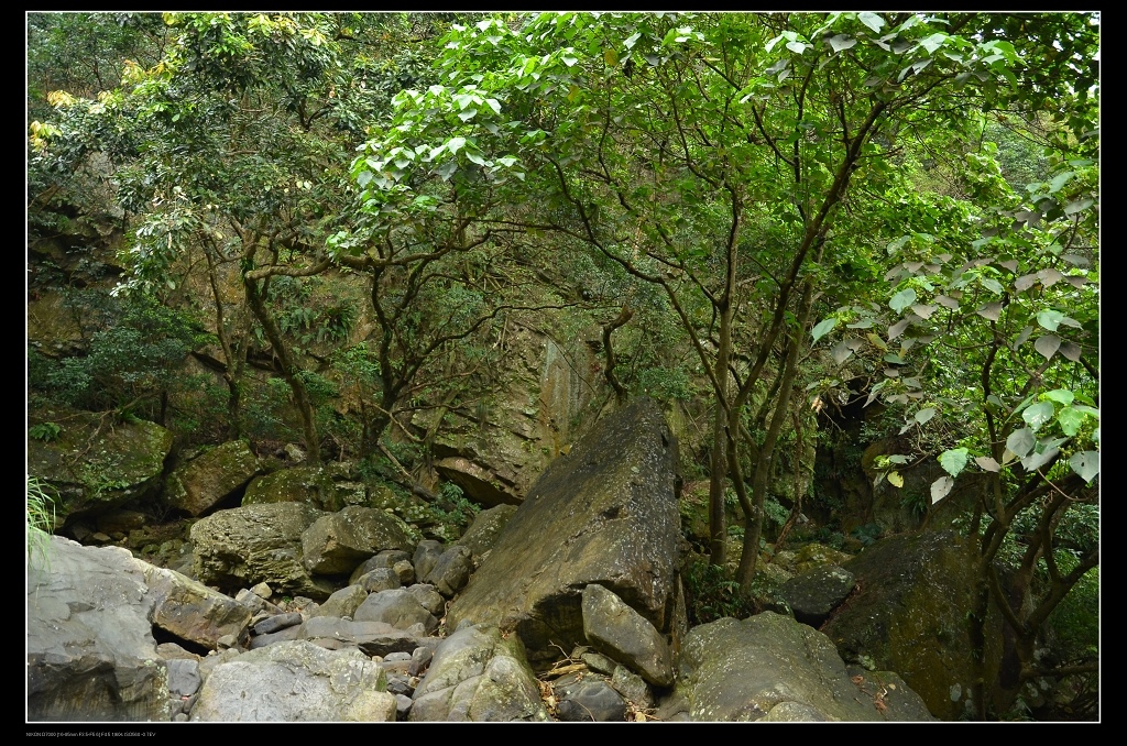 瀑布位於大山壁底下,看起來岩層似乎挺容易崩落,到處都是巨石
