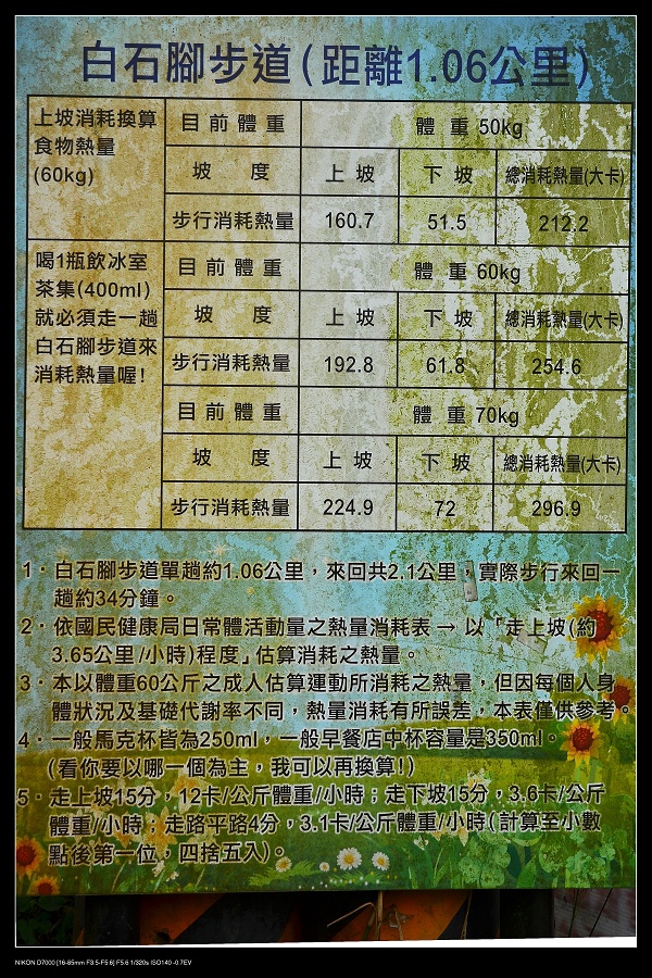 往猴洞坑瀑布這條路叫白石腳步道,長度只有1.06公里,來回只要半個小時,這標示牌還挺有趣,直接幫你換算,若50公斤的人走一趟可消耗212大卡,等於只消耗喝一瓶茶飲料的熱量
