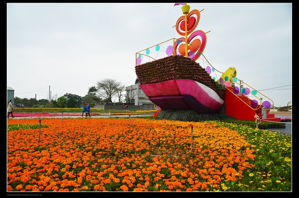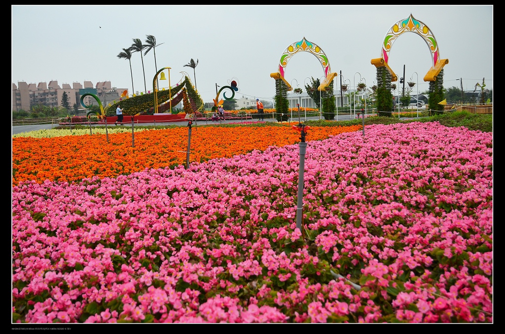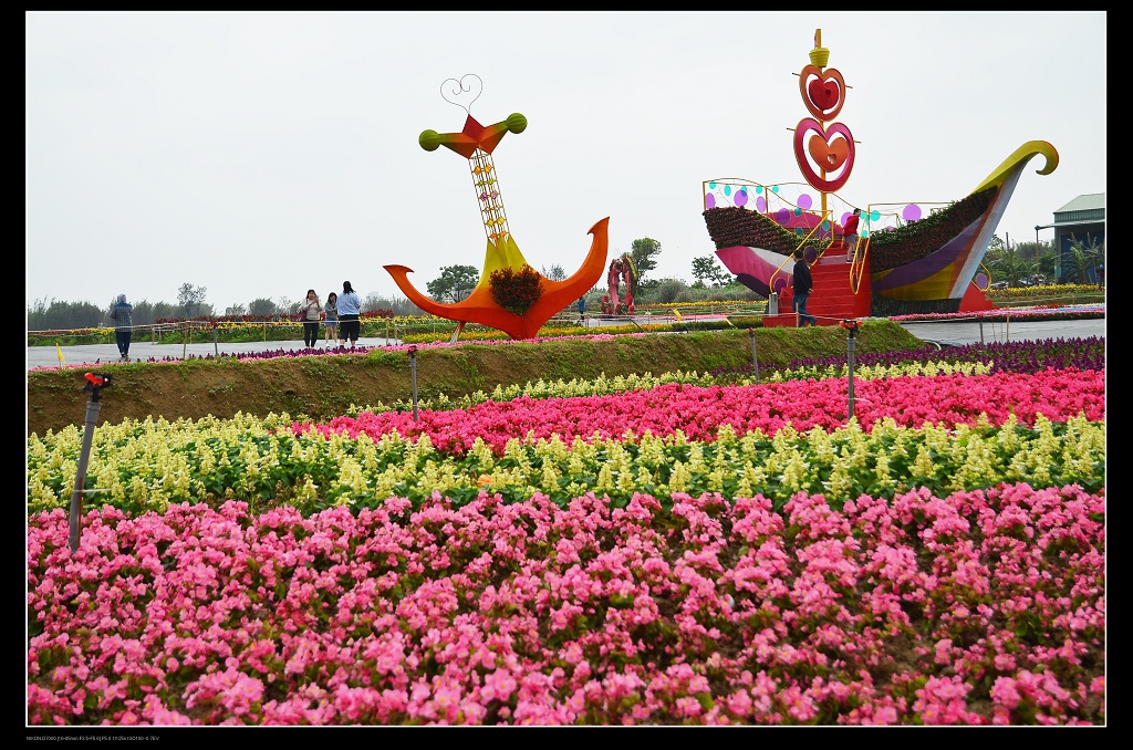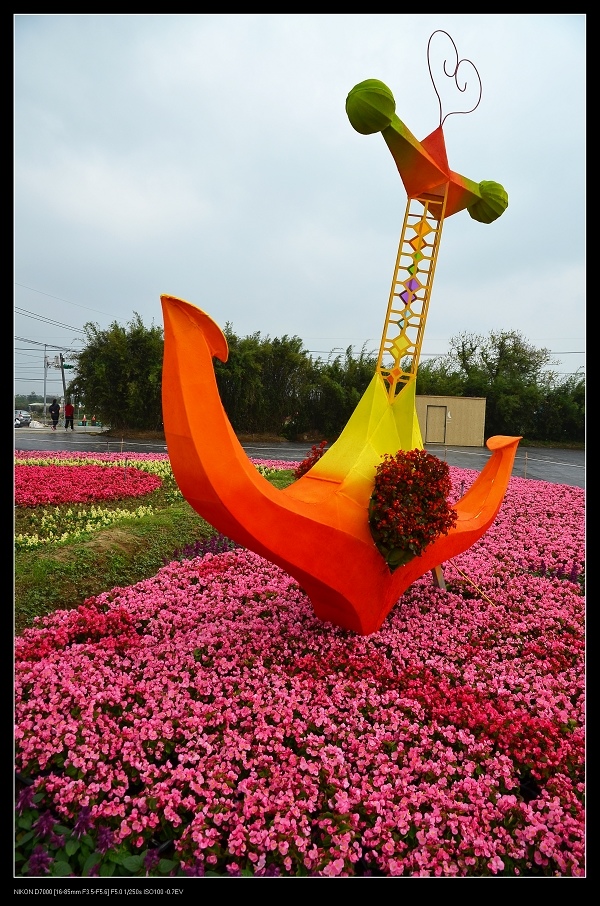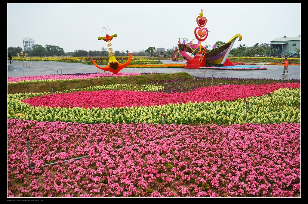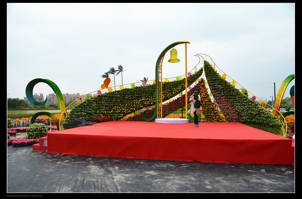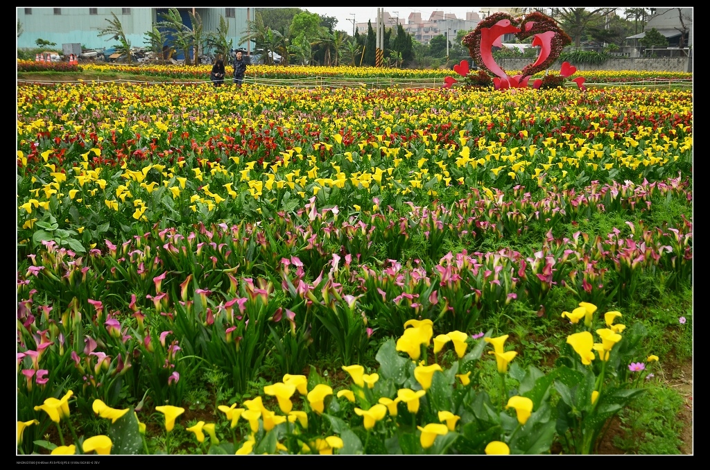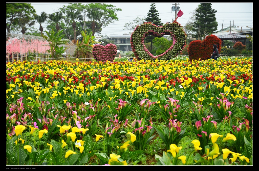 現場除了海芋,還有用各種花卉布置的圖形花海,雖然有搭高台讓民眾由上往下拍,但在平面拍的感覺,花比較密實