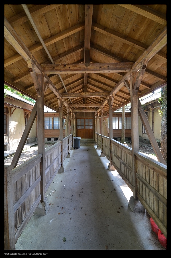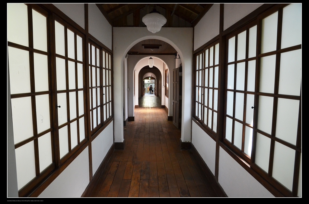 這建築1931年上樑,中央是磚造建築,屋頂是簡便鋼樑結構,這樣才能擴大內部空間,南北兩側有傳統日式宿舍,中間有兩條木作廊道作聯繫
