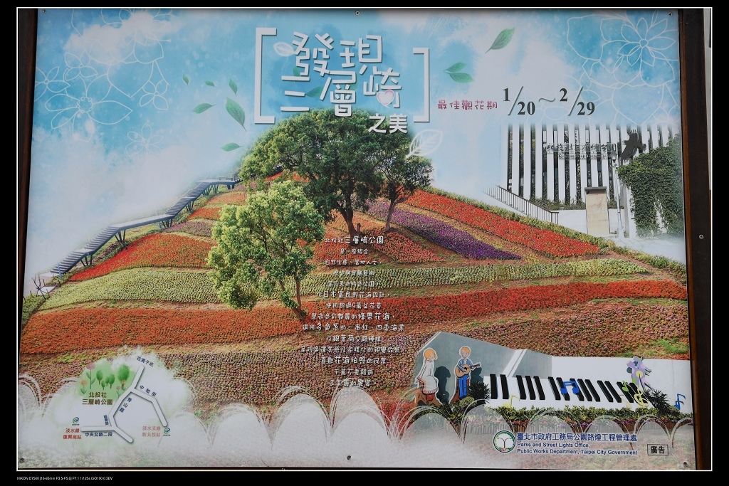 過了橋就可看到這北投社三層崎公園的招牌,爬一點小坡就可看到彩虹花海