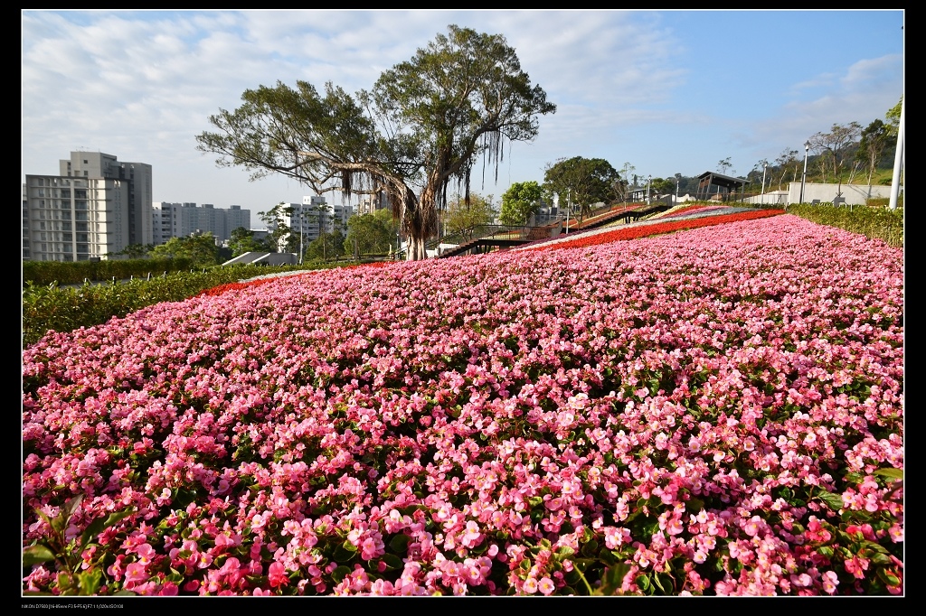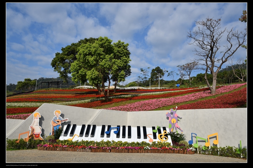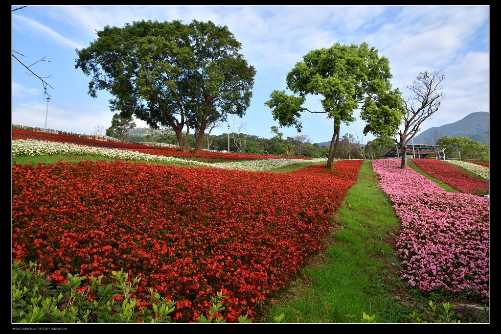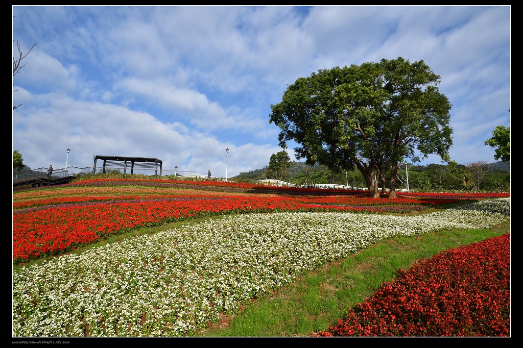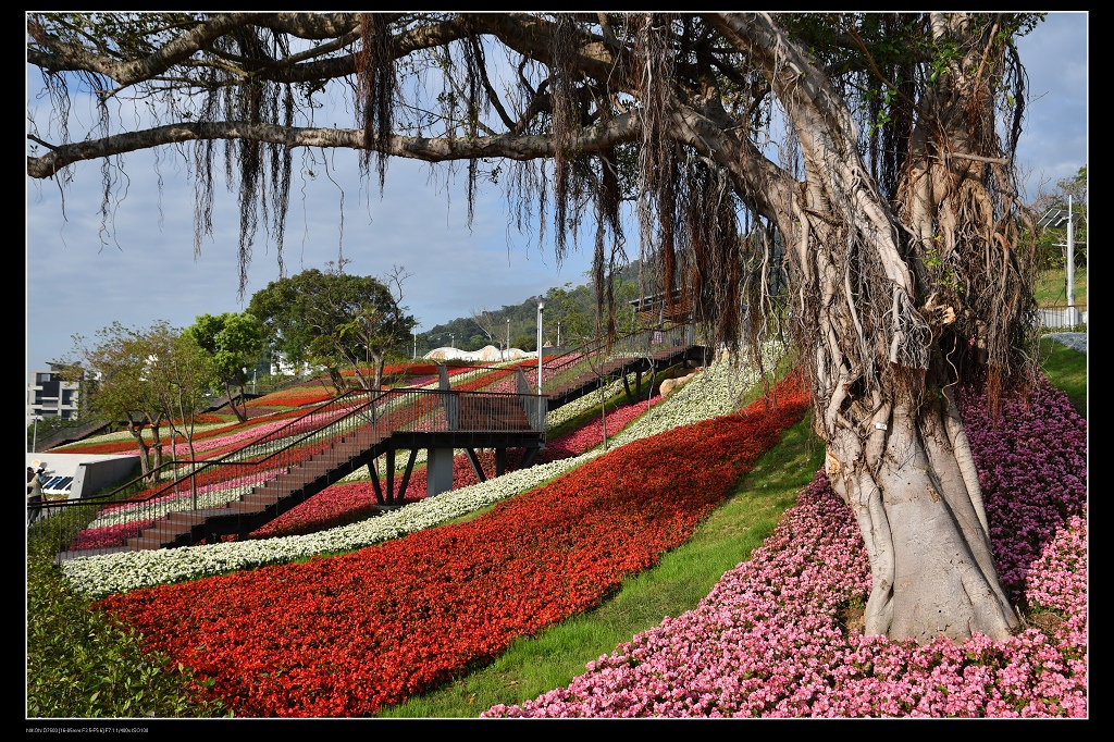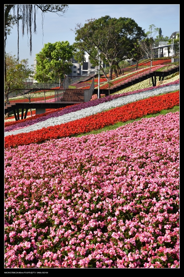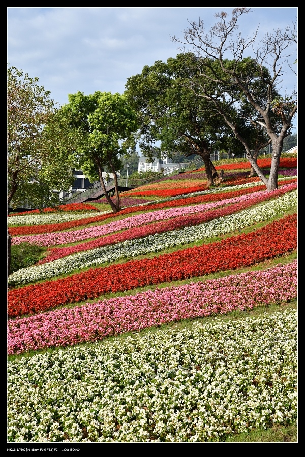 這片花海由一串紅,銀葉菊,四季海棠等草花,綿延二千五百平方公尺花毯,讓台北人過年又多了一處賞花景點