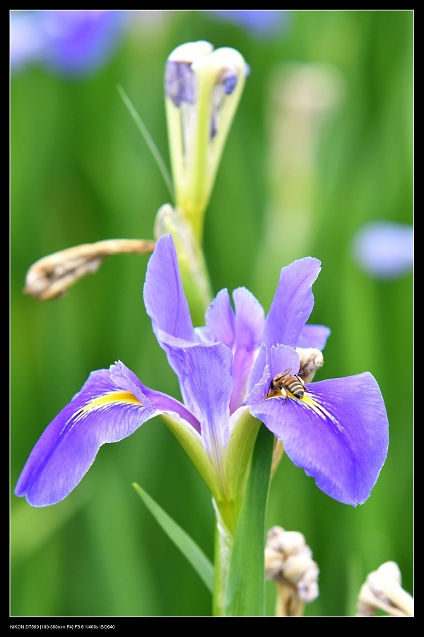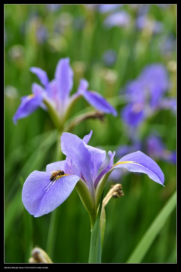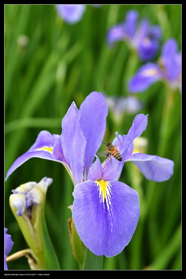 鳶尾花花蜜似乎在花瓣上就有,所以蜜蜂直接在外面就可採蜜