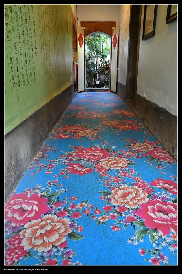 地面上舖陳的是客家花布風,牆面上也講述著這建築的歷史及典故