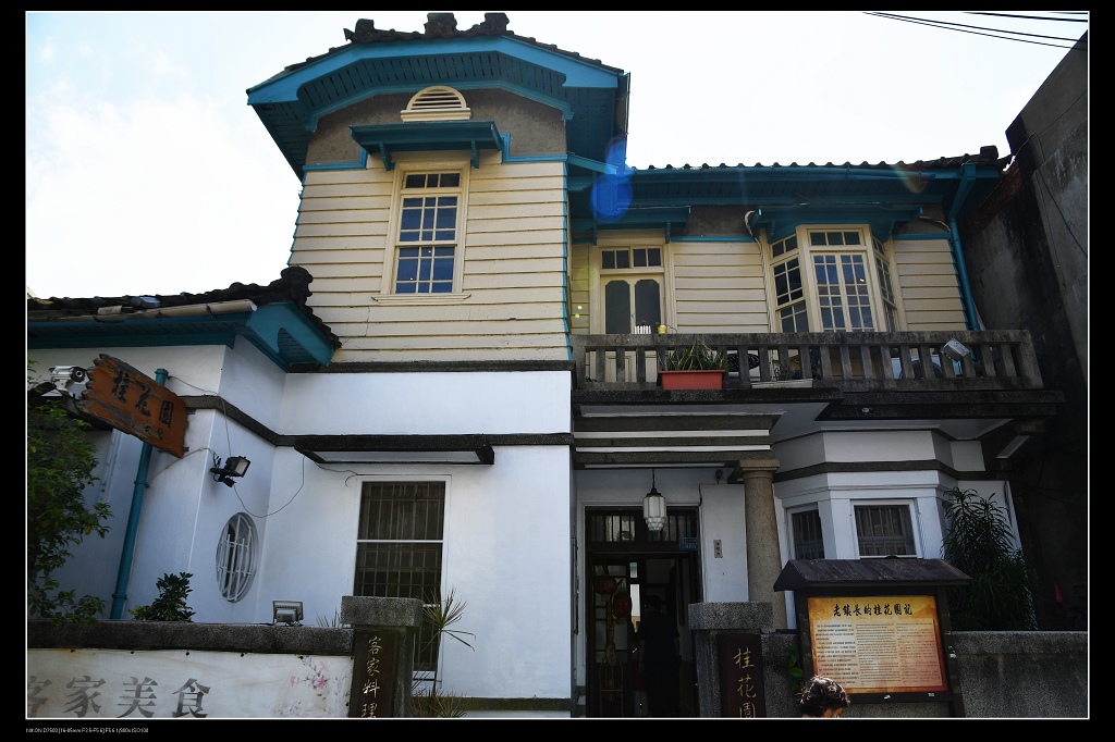 新埔桂花園人文客家餐館,是一棟建於民國24年,外觀非常漂亮的三級古蹟餐廳,融合台灣土角厝,和式切角屋頂,鬼瓦及西洋羅馬柱,八角窗三種味道,日據時代是新埔地區最時髦的建築物,