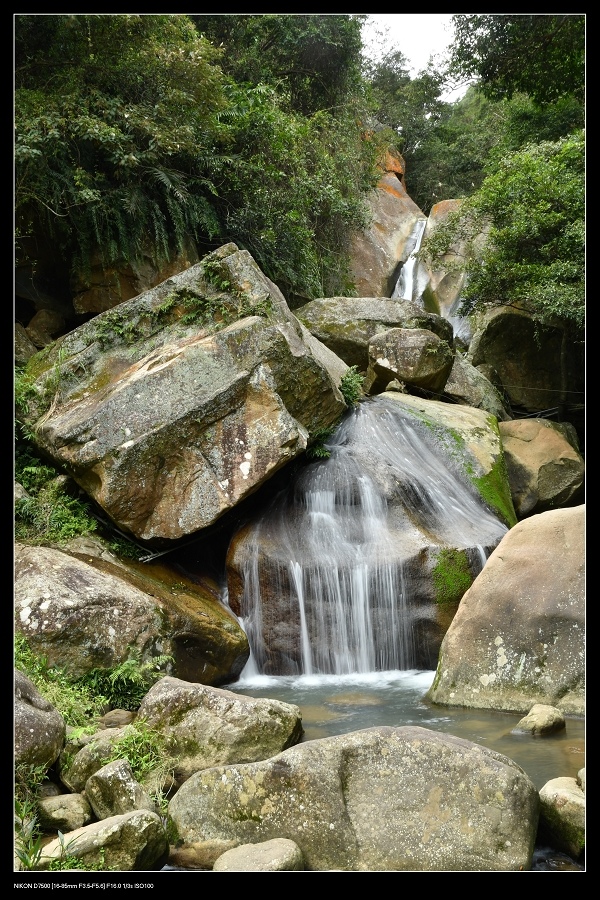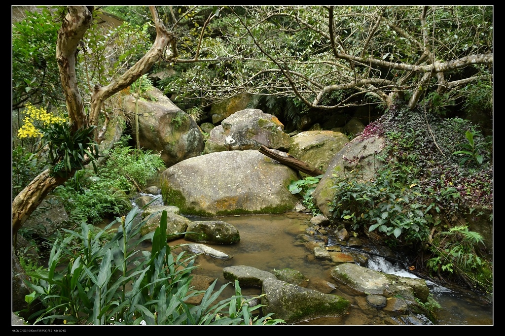 溪床中有很多巨石,因水流不大,上面爬滿各種植物