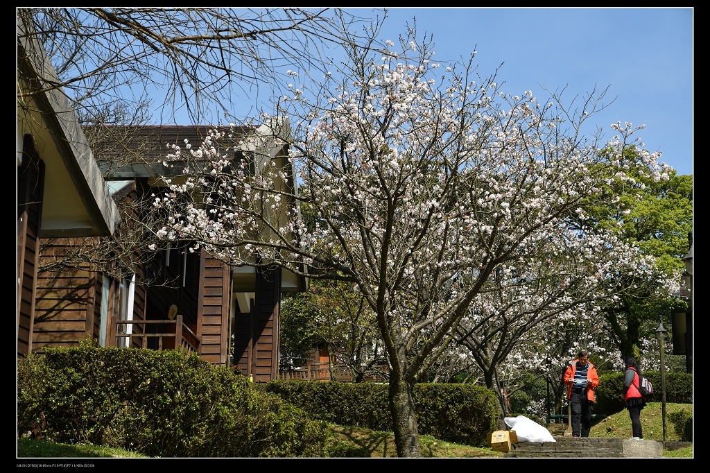 陽明山上處處有櫻花,但每個地方都是滿滿的人,陽明山菁山遊憇區內這排小木屋前,一整排吉野櫻,可以在此輕鬆自在賞花