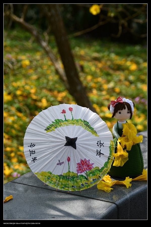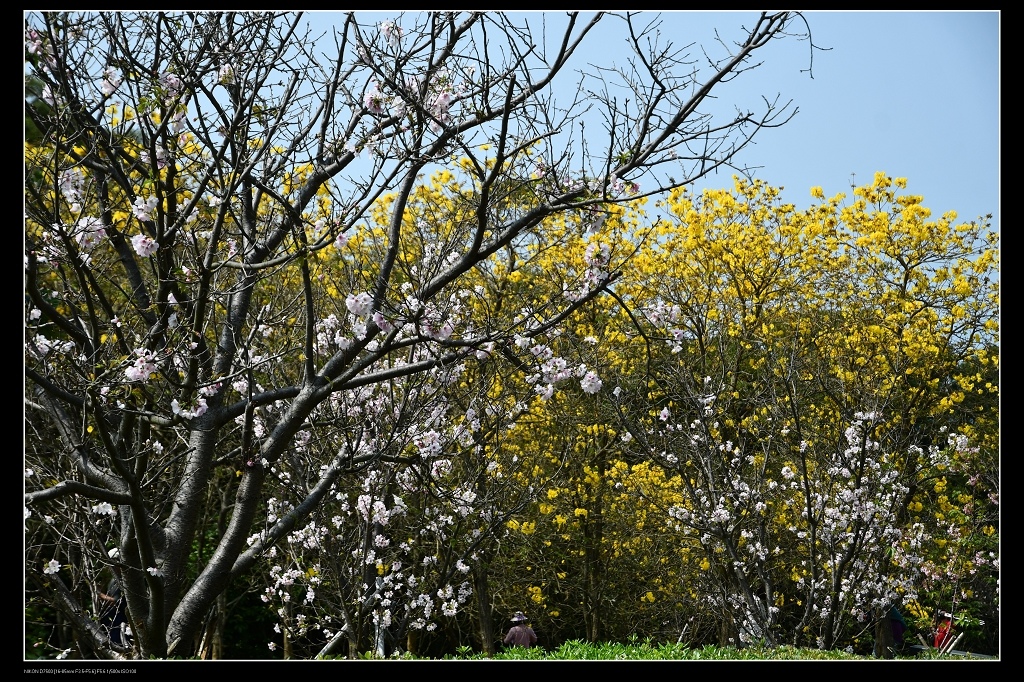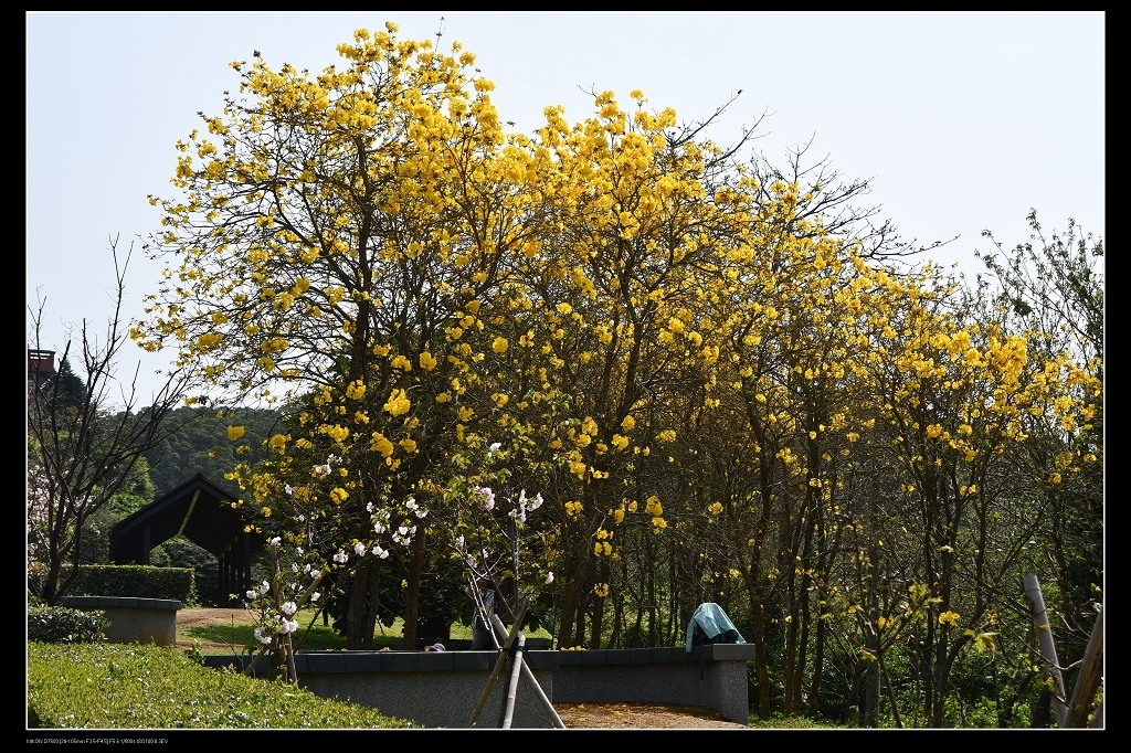 在愛維養護中心裡賞黃花風鈴木,可以用櫻花當前景,非常幸福