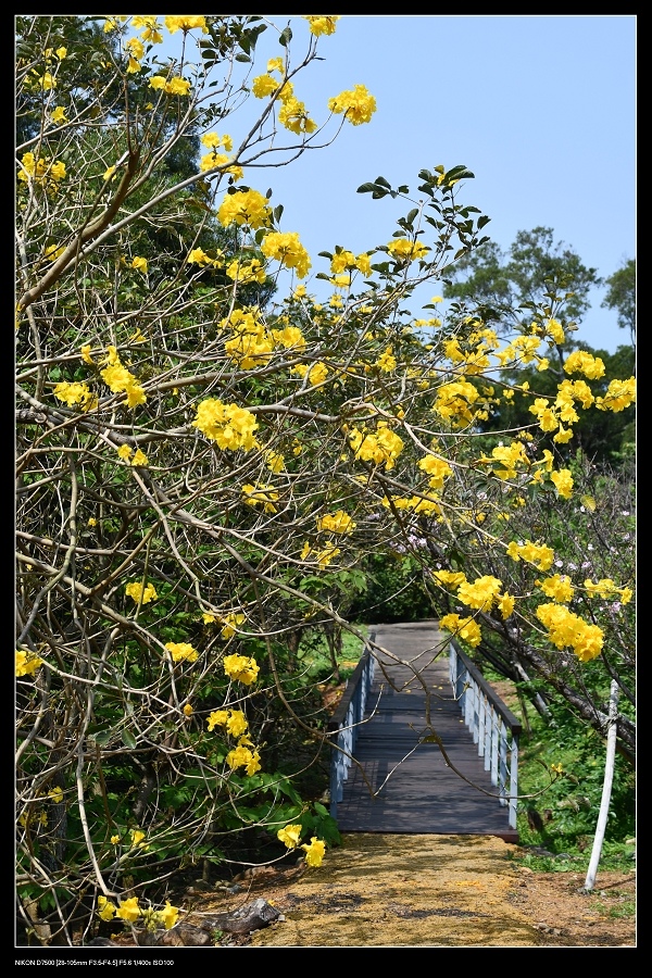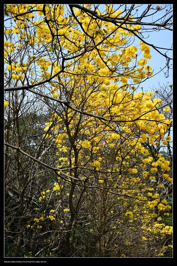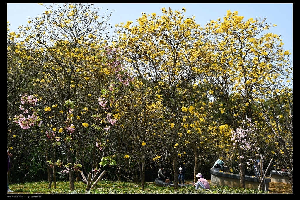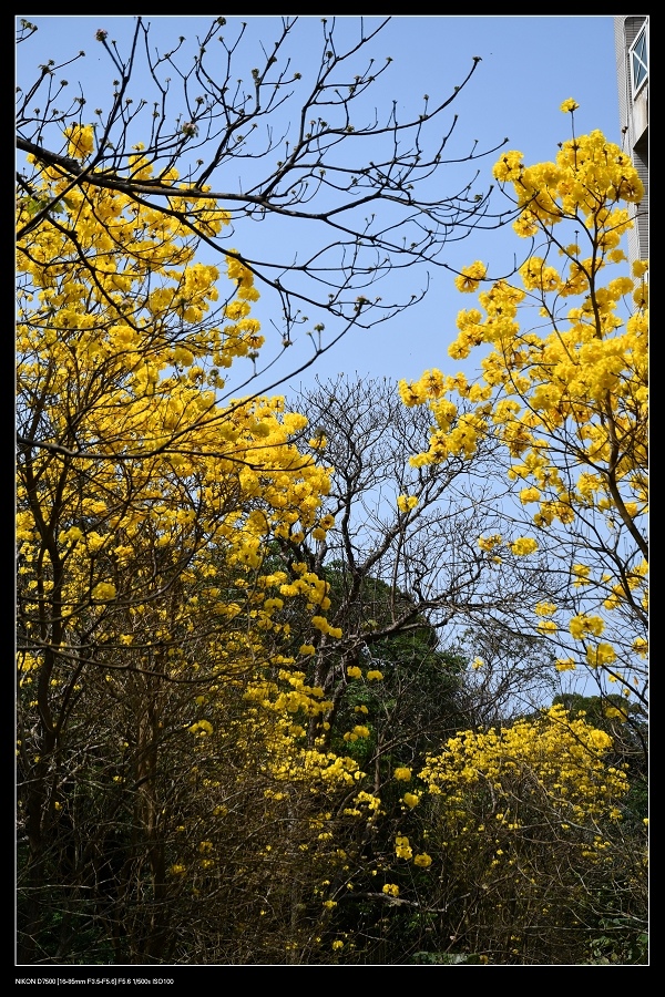 台北人要賞黃花風鈴木,在新北市八里區愛維養護中心這裡就有很大一片,三月中一整片林子開滿黃花