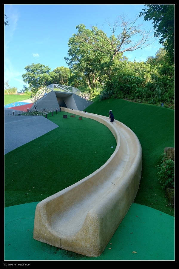 趣探險之丘有一條46公尺磨石子溜滑梯,因坡度很陡,限12歲以上使用