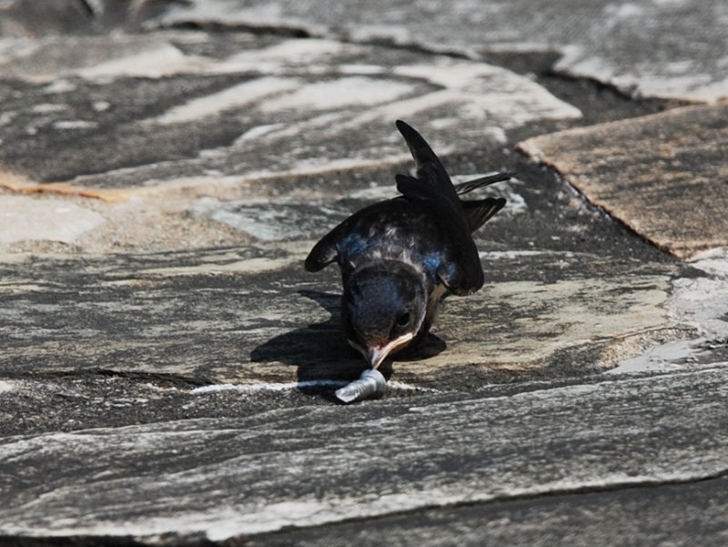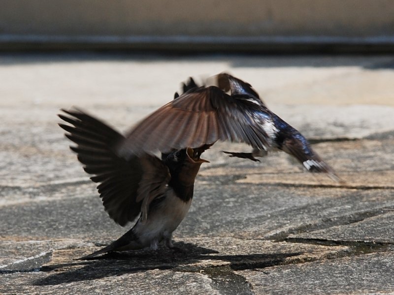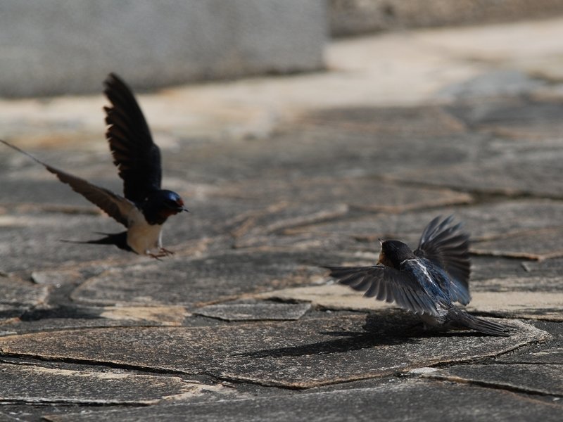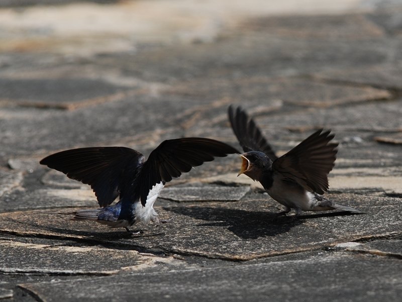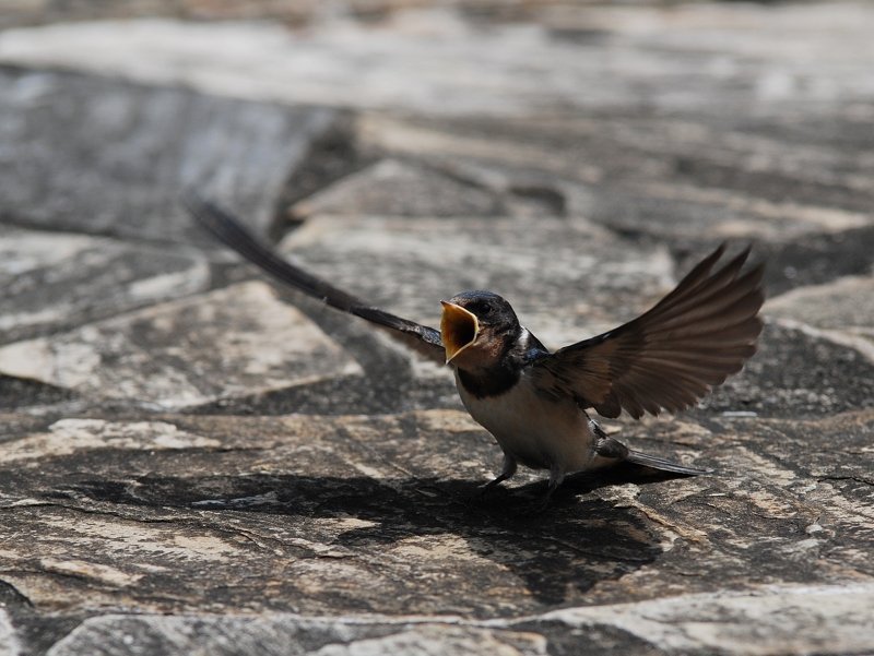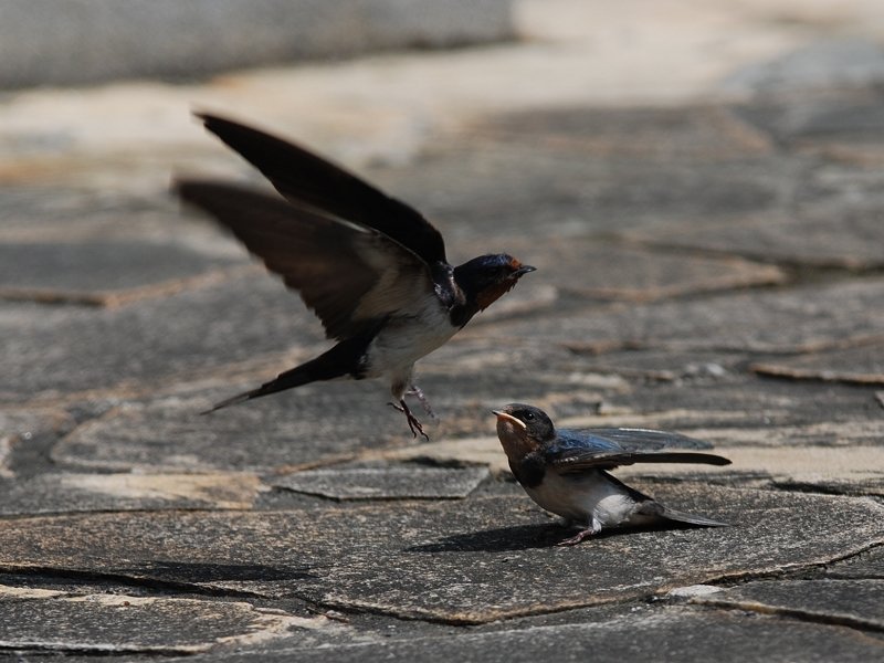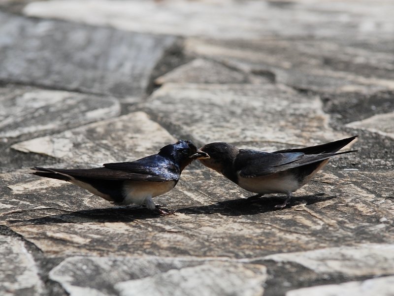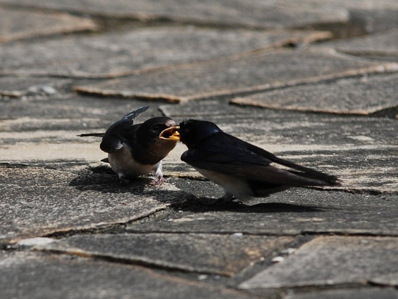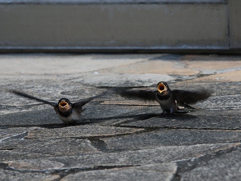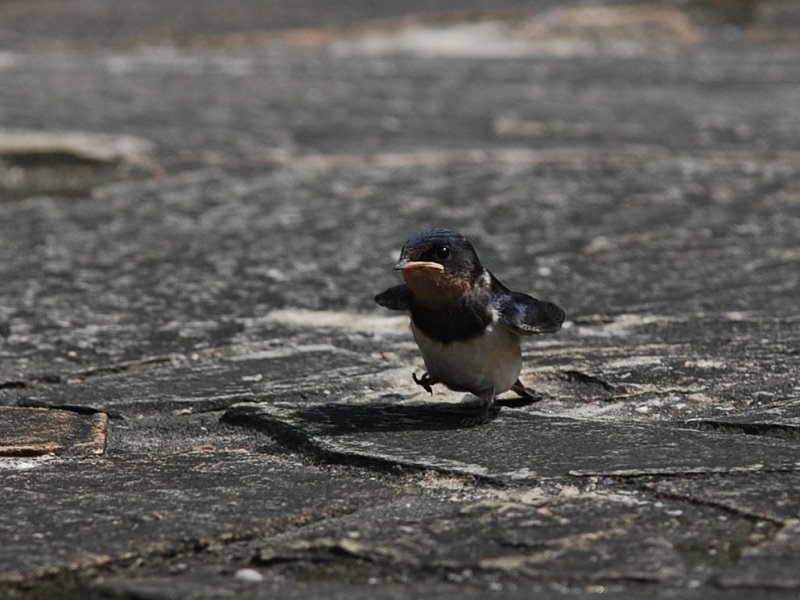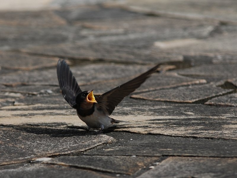 剛離巢的小燕子,還不太會飛,活像隻小企鵝,成鳥在天空捕捉昆蟲,他們就在地上到處跑